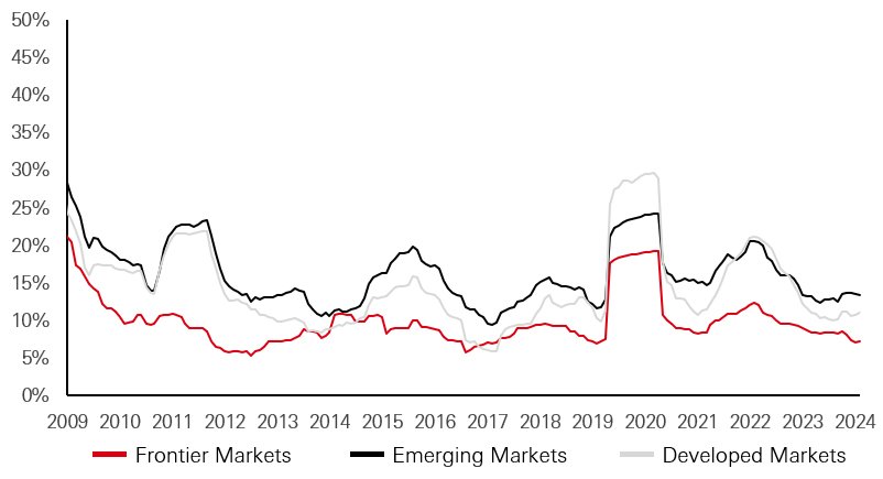 Despite the long-term growth potential, direct investment in Vietnam is likely to be a challenging option for many global investors who must evaluate the implications for their risk budgets. Accordingly, we advocate for exposure to such opportunities through a frontier markets allocation. Vietnam carries the largest weighting in the MSCI Frontier Markets index, at roughly one quarter of the index. Importantly for risk-averse investors, unique economic drivers in individual frontier market countries mean that intra-country correlations are low – resulting in relatively low volatility at the asset class level.