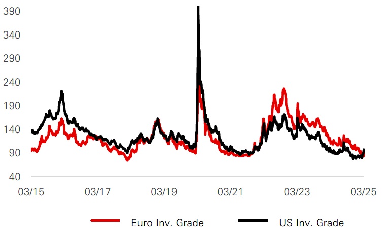 - Overall, spread valuations in European credit markets remain tight, calling for cautious positioning amid macroeconomic uncertainty. However, elevated yields and sector diversification, particularly in hybrid securities and sustainable bonds, offer opportunities for investors seeking higher returns without sacrificing credit quality