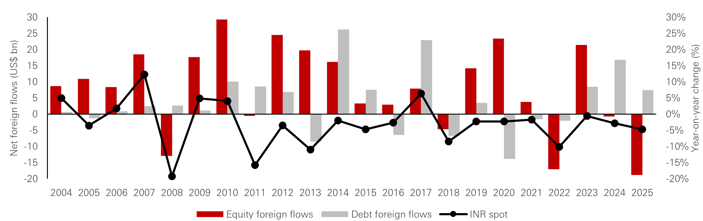 Figure 8: Net foreign flows in India market capital versus INR/USD spot change year-on-year