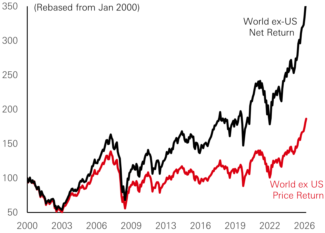 After a long period in which investors were rewarded primarily for owning growth — and, in practice, a relatively narrow group of US growth stocks — the case for income is becoming more compelling. That is not because growth no longer matters, but because the market backdrop has become broader, more volatile and more sensitive to valuation. In that environment, dividend and income strategies offer a useful way to balance participation in equity markets by relying less exclusively on price appreciation to deliver returns. The underlying reason is that dividends remain a significant driver of long-term equity returns. Over the past two decades, more than half of total global equity returns have come from reinvested dividends.