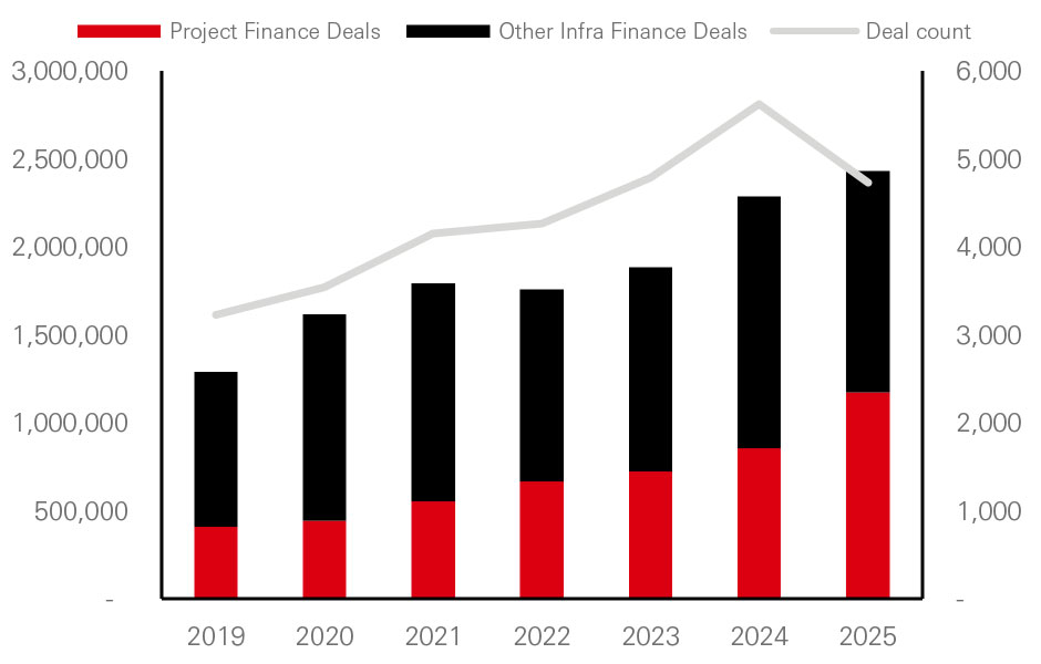 Global infrastructure finance value (USDm) and volume, 2019-2025