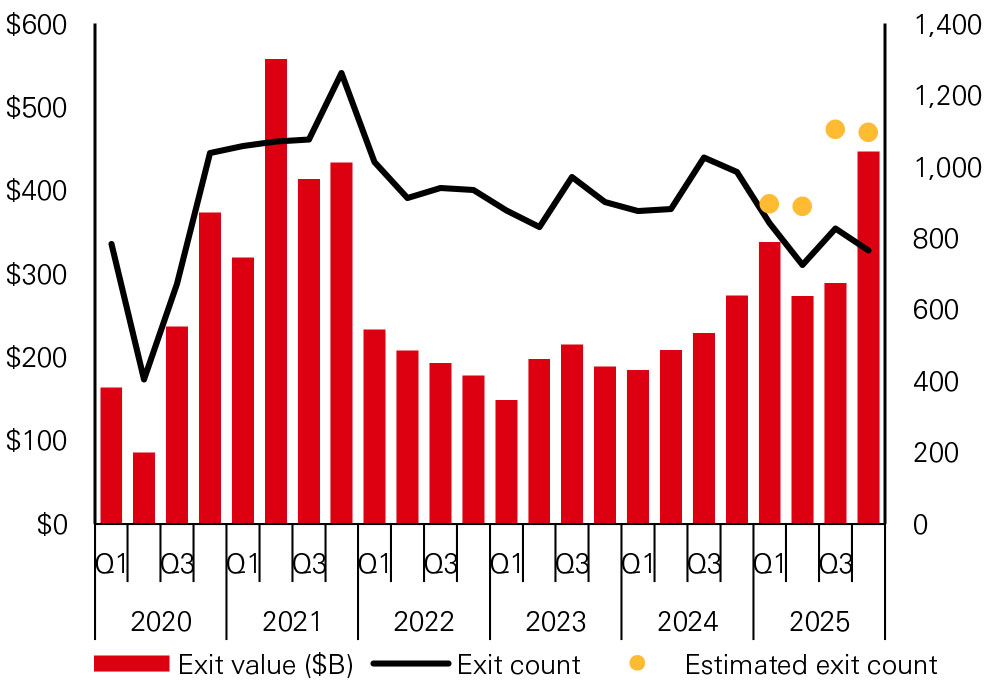 2025 has been the strongest year for exits since 2021. Exit value over the year was USD1.35tn, 50 per cent higher than in 2024. Exit count rose over 5 per cent in 2025 compared to 2024. Q4 2025 saw total exit value rising to USD446.7 billion, the highest level since Q2 2021, with technology and healthcare sectors leading the way. Among the key drivers of strong exit activity in H2 2025 has been a resurgence in M&A. There was a strong rebound in M&A, which reached a record high of nearly USD5 trillion in deal value in 2025, driven by several billion-dollar-plus transactions. IPOs are also recovering.