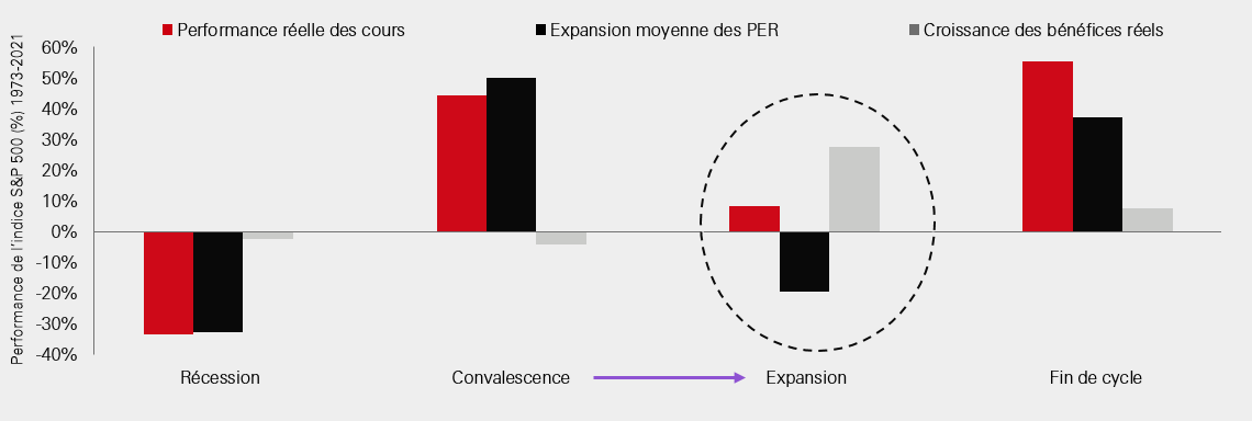 Lors de cette phase d'expansion, l’économie va se consolider et accélérer, les marchés de l'emploi vont s’améliorer et les bénéfices des entreprises vont augmenter. Toutefois, la tendance historique va dans le sens d’une moindre performance globale des actions en milieu de cycle par rapport à ce que les investisseurs peuvent espérer lors des phases de reprise qui précèdent. Nous devons être réalistes. Après une période durant laquelle l'optimisme accru des investisseurs a réduit la perception du risque et entraîné une réévaluation des classes d'actifs risquées, les perspectives sont désormais inversées. Les valorisations vont de plus en plus pénaliser le potentiel de performance.